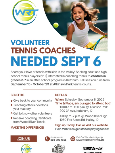 Are you a tennis player looking to give back to your community? We're partnering with City of Ketchum and U.S. Tennis Association, Idaho (USTA Idaho) to find adult and high school tennis players (age 16+) to coach beginning tennis to 3rd-7th graders.